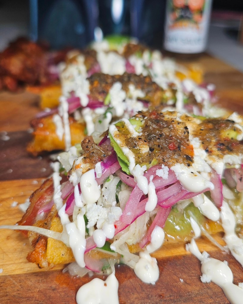 I mixed together chorizo and refried beans and added them into a corn tortilla with mozzarella. I cooked the tortilla and mixture in a shallow pan with oil until crispy and once ready I added in all the accoutrements . First a layer of guacamole, cilantro cabbage, pickled red onion, avocado, and Mexican crema. And since @eatmigos is based out of Texas I had to add in some Texas hot sauce so grabbed a fresh bottle of the very wicked @mikeyvshotsauce Sam Sauce.