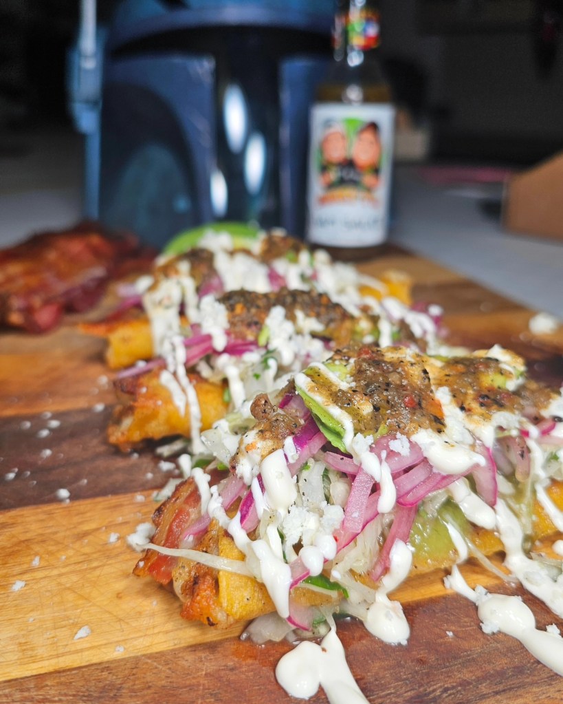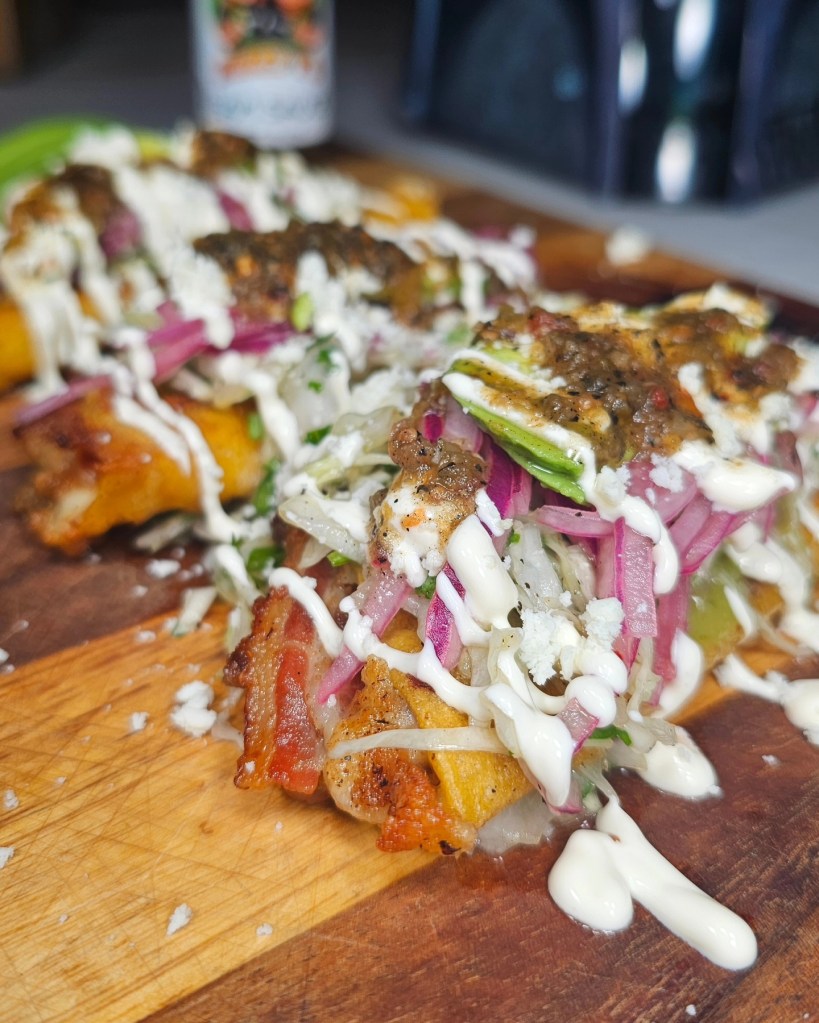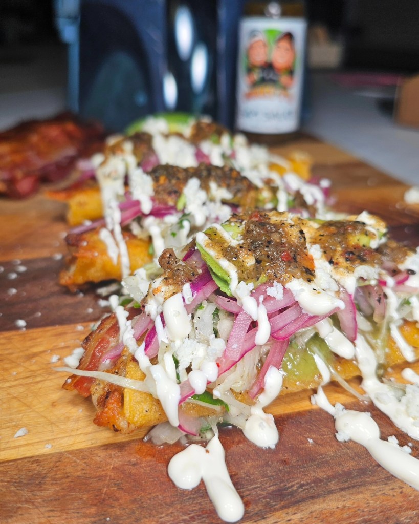 A few years back my taco brethren Chris from @eatmigos worked with a taco shop to bring his own taco concept to life. That taco was packed with refried beans, chorizo, cheese and bacon in a flour tortilla, it’s a delicious mixture and since it’s been a while since I tried to make one at home I figured we’d try again. This time I made them in the style of my favorite tacos, Dorados.