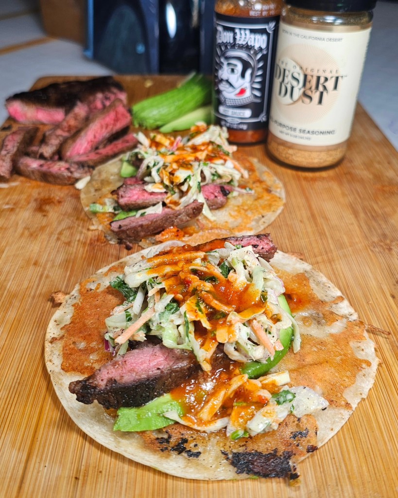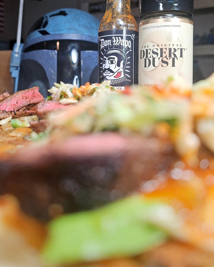 It’s ALWAYS a great night for steak. Last night I seasoned up a few New York Steaks with a combination of @getdesertdust original and @donwapohotsauce La Primera then grilled them up in a cast iron.