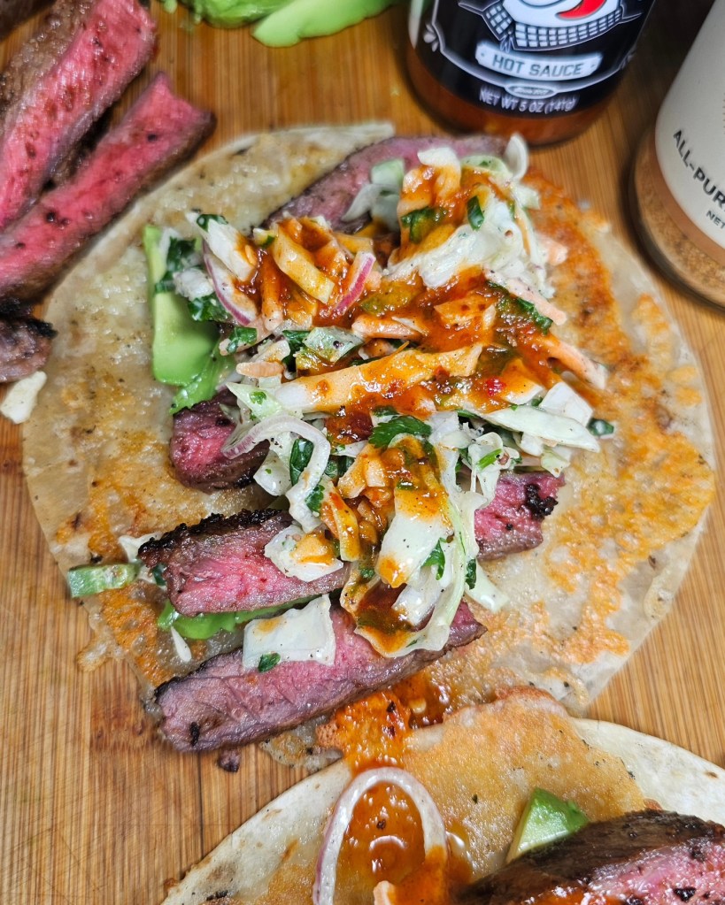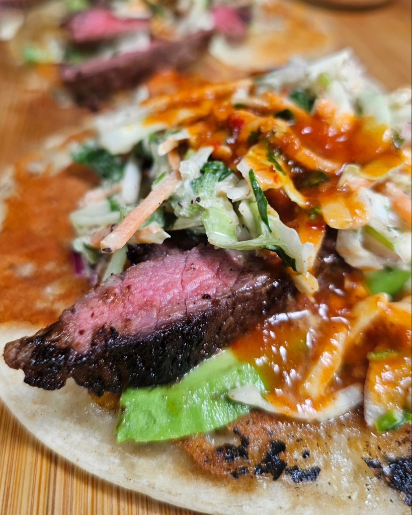 I layed the steak into a cheese’d up flour tortilla with a scoop of cabbage slaw I made using green cabbage, cilantro, red onion, carrots and a honey mustard cream sauce I made using some Don Wapo to spice things up.
